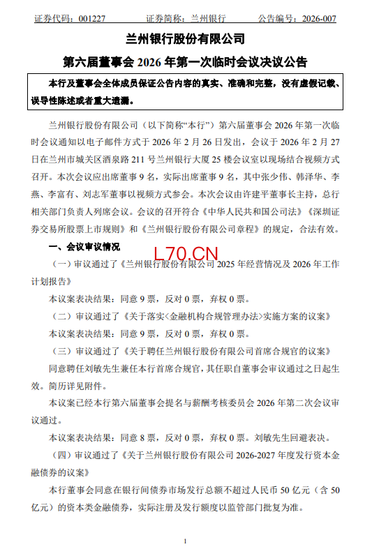 兰州银行:聘任行长刘敏兼任首席合规官