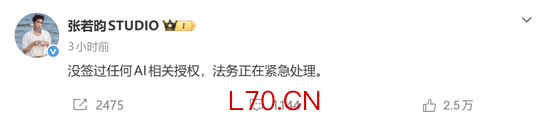 4月20日,张若昀工作室官方微博发文称:“没签过任何AI相关授权,法务正在紧急处理。”