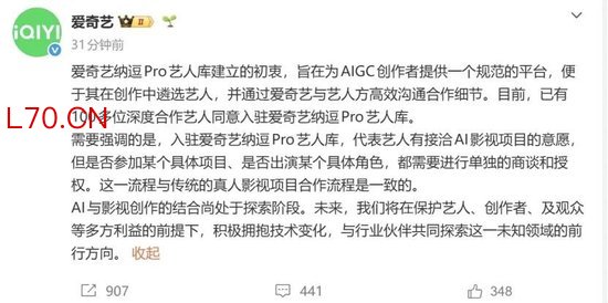 爱奇艺表示,AI与影视创作的结合尚处于探索阶段。未来,爱奇艺将在保护艺人、创作者、及观众等多方利益的前提下,积极拥抱技术变化,与行业伙伴共同探索这一未知领域的前行方向。