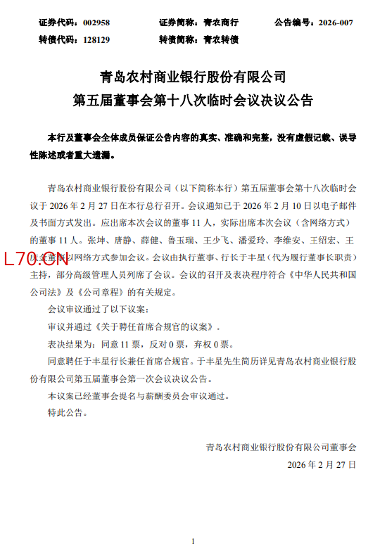 青岛农商行:聘任行长于丰星兼任首席合规官