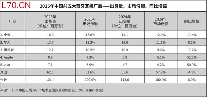IDC:2025年中国无线耳机出货12137万台同比增长6.9%