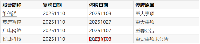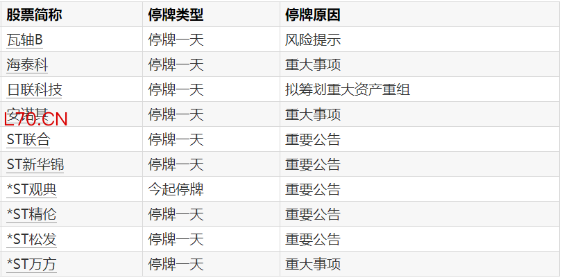 A股停牌提示:10股今日停牌