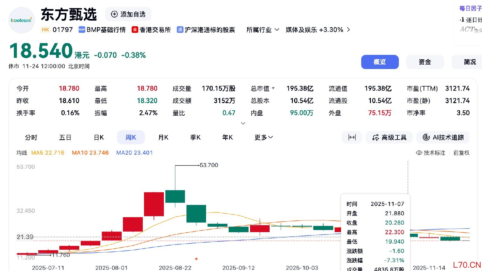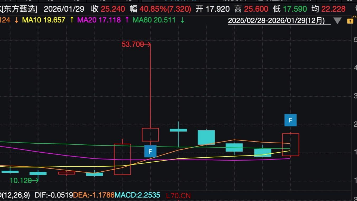 年初至今,东方甄选股价由17.92港元涨至上个交易日的27.48港元,涨53.3%。